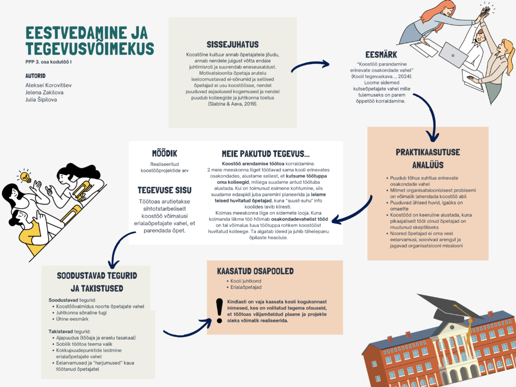 Konkreetse tegevusena tõin õppetöö käigus välja idee korraldada õpetajatevaheline koostöö-töötuba, mille sisu ja vorm kujunesid välja nii kolleegidega arutledes kui ka sobivat teoreetilist alust otsides. Töötuba on kavandatud formaadina, mis ühendab erinevate õpetajate teadmisi, kogemusi ja vahendeid selliselt, et sünniks uus ühine teadmusruum. Tegevuse planeerimise käigus tuginesin Schihalejeva (2017) käsitlustele organisatsioonikultuurist, mis eristavad mitmesuguseid koolikultuuri tüüpe, sealhulgas bürokraatlikke, toksilisi ja kollegiaalseid tunnuseid. Minu töökeskkonnas on märgata eri kultuurielementide segunemist, kuid paraku ilmnevad kõige teravamalt bürokraatliku ja toksilise kultuuri jooned, mis väljenduvad näiteks liigses formaalsuses, piiratud suhtluses ning väheses vastastikuses tunnustamises. Selline keskkond võib pärssida õpetajate loovust, motivatsiooni ja professionaalset arengut, mis omakorda mõjutab õppe- ja kasvatustöö kvaliteeti.