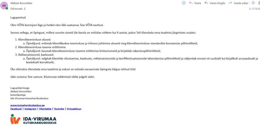 Tõendusmaterjal 1: VÕTA-ga seotud e-kirjavahetus, kus ma VÕTA komisjoni liikmena selgitan taotluse menetlemise loogikat ning palun taotlejal esitada täiendavaid tõendeid konkreetsete õpiväljundite osas. See näitab, et informeerin osapooli VÕTA protsessist ja nõuetest ning suunan, kuidas oma teadmisi ja oskusi tõendada.