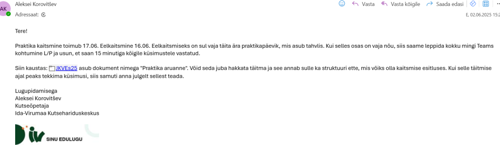 Praktika lõpetamise etapi e-kiri, kus annan teada eelkaitsmise ja kaitsmise ajad, juhendan praktikapäeviku täitmise osas (Tahvel), jagan aruande malli asukohta ning pakun vajadusel lühikest individuaalset Teamsi kohtumist. See tõendab nii hindamis- ja korraldusinfo edastamist kui ka tugikanali pakkumist.